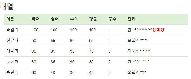 //평균 95이상이면 장학생 (진하게, 빨강색)