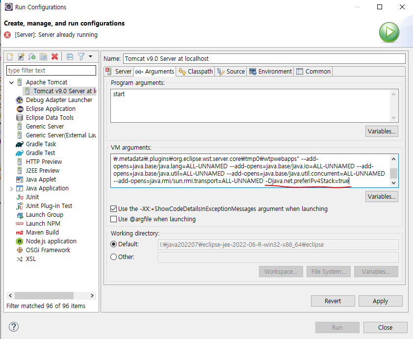 Run -> Run Configurations -> Tomcat Server -> (x)=Arguments -> VM arguemnts에 아래와 같이 추가 -> 공백 1칸 주고 -Djava.net.preferIPv4Stack=true -> Apply