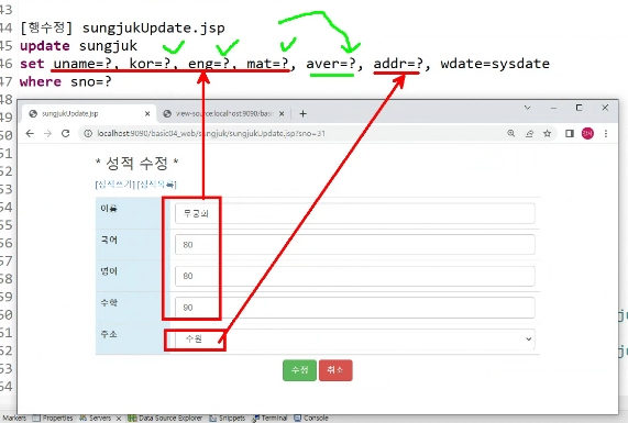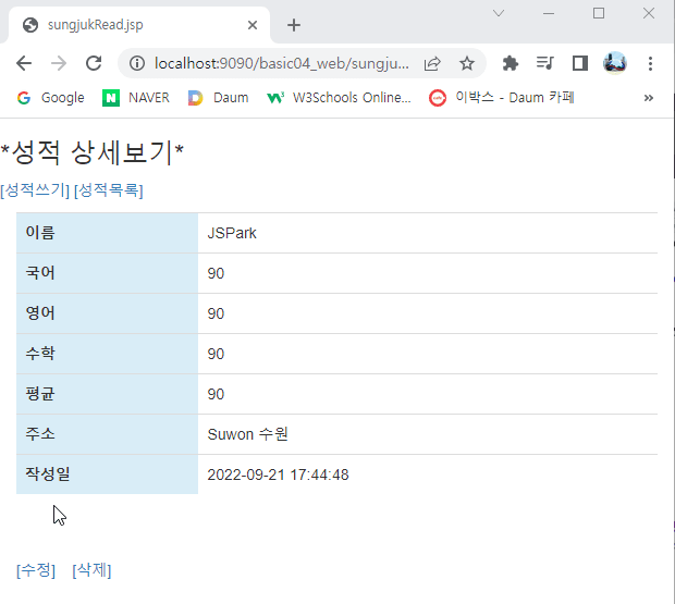 이제 sungjukUpdateProc.jsp를 만들어, 수정 페이지에서 수정할 데이터를 입력하여 수정 버튼을 누르면 데이터가 수정되도록 하자
