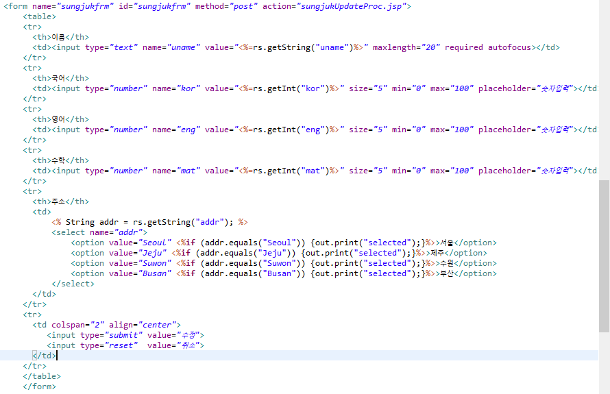 <form name="sungjukfrm" id="sungjukfrm" method="post" action="sungjukUpdateProc.jsp">