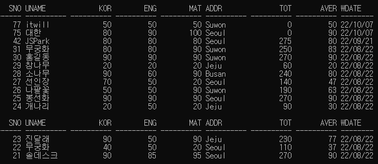 sql.append(" SELECT sno, uname, kor, eng, mat, aver, addr, wdate ");