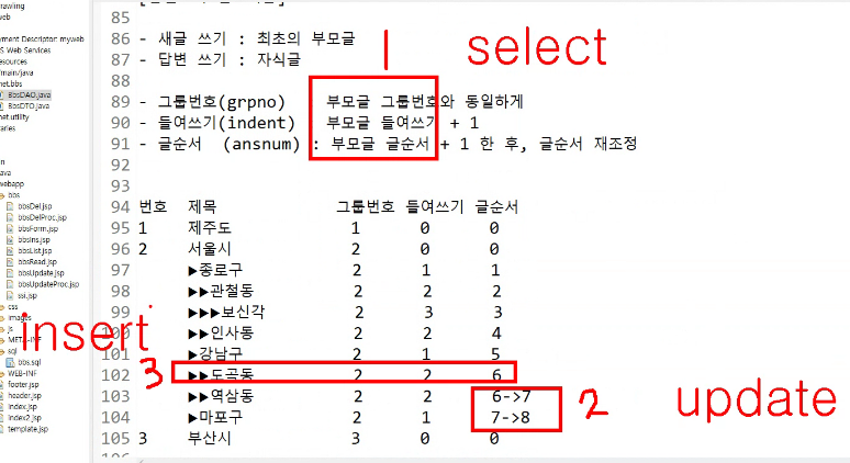 - 글순서(ansnum) : 부모글 글순서 + 1 한뒤, 글순서 재조정(update)