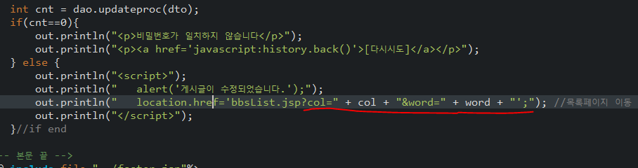 out.println(" location.href='bbsList.jsp?col=" + col + "&word=" + word + "';"); //목록페이지 이동