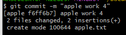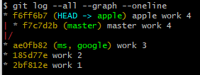 현재 상태는 apple에 있다.(HEAD가 가리키고 있음) aple work 4의 부모는 work 3이다. 그리고 master work 4의 부모도 work 3이다. 그것을 그래프 (좌중단에 빨간색 | 표시)로 보여주고 있다.
