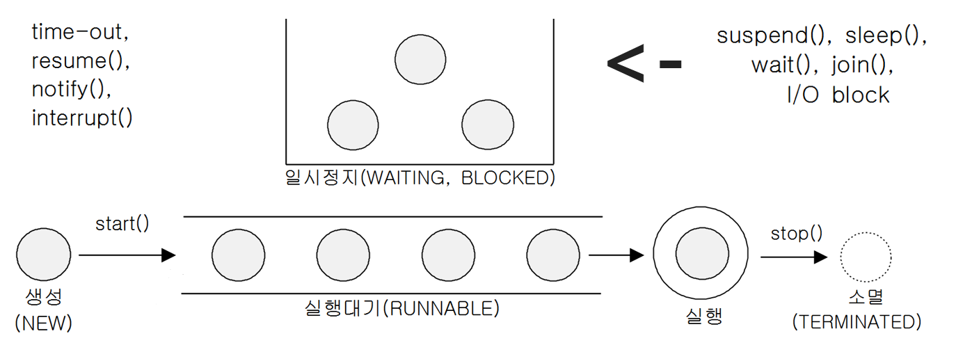 - 지정된 일시정지 시간이 다 되거나(time-out), notify(), resume(), interrupt()가 호출되면 일시정지 상태를 벗어나 다시 실행대기열에 저장되어 차례를 기다린다.