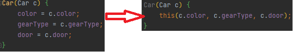 생성자 Car(Car c)는 위와 같이 생성자 Car(String color, String gearType, int door)를 호출하는 것이 좋다. 새로 코드를 작성하는 것보다는 기존의 코드를 활용하는 방안을 고민하자