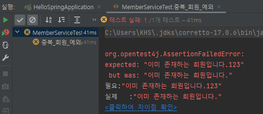 assertThat(e.getMessage()).isEqualTo("이미 존재하는 회원입니다.123");