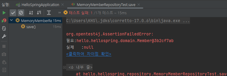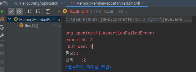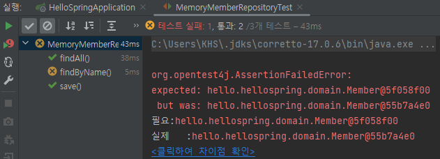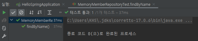 개별로 했을 때는 테스트가 다 통과가 되었는데 한 번에 돌리니 findByName()에서 실패가 발생했다. 실행 순서는 보장이 되지 않는다. 그래서 모든 테스트는 순서에 영향을 받지 않고 따로 동작하도록 설계를 해야 한다.