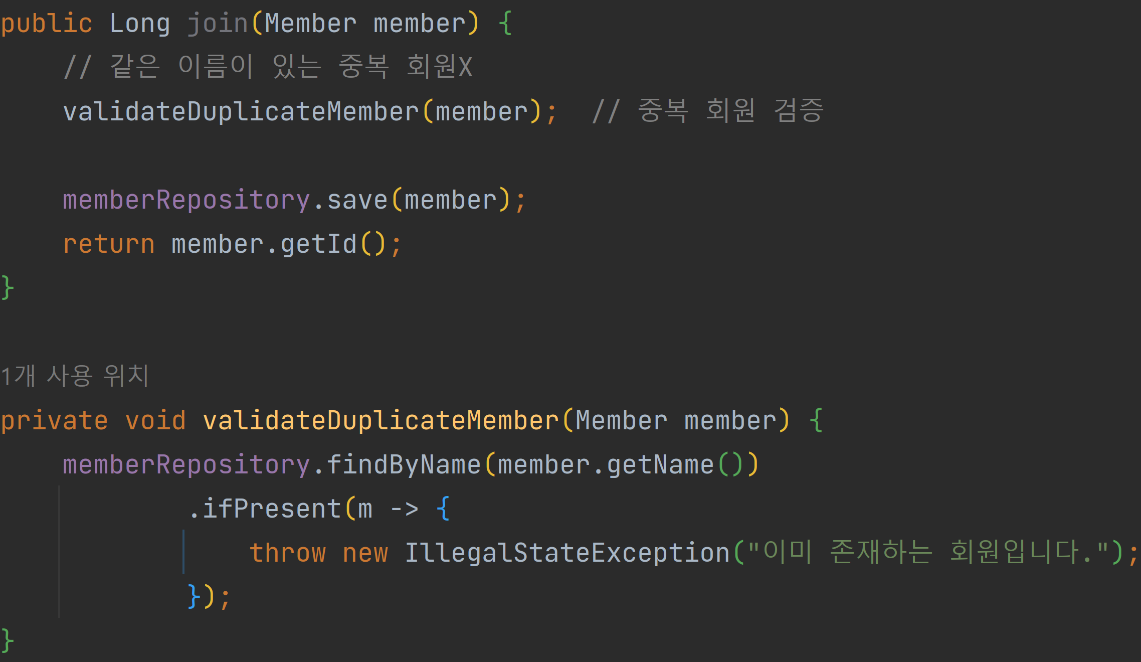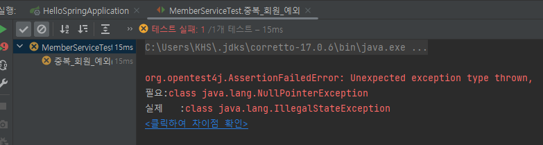 IllegalStateException e = Assertions.assertThrows(IllegalStateException.class, () -> memberService.join(member2));