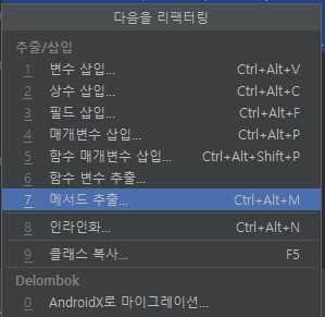 이렇게 로직이 쭉 나오는 경우에는 메서드로 만드는 것이 좋다. (단축기 Ctrl+Alt+M) (리팩터링 목록은 Ctrl+Alt+Shift+T)