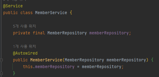 회원컨트롤러가 회원서비스를 통해 회원가입을 하고 데이터를 조회할 수 있어야 한다. 이를 회원컨트롤러가 회원서비스를 의존한다고 한다.