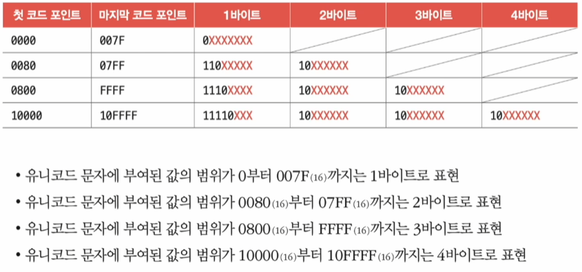 - 인코딩 결과가 몇 바이트가 될지는 유니코드에 부여된 값에 따라 다름