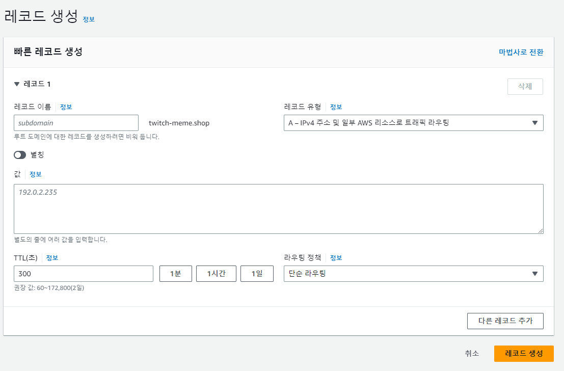 Route 53에서 레코드 생성을 클릭한 후 생성한다.