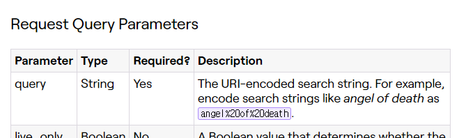 query라는 파라미터로 검색어를 보낼 때 URI 인코딩을 해야 한다고 나와있다. 그래서 URI 인코더로 인코딩 해서 요청했는데도 여전히 결과를 못가져왔다.