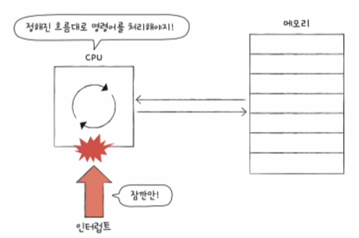 CPU는 현재 실행 중인 프로그램을 실행하다가 인터럽트가 발생하면 해당 명령어까지 실행 후 그 인터럽트로 돌아가서 인터럽트를 실행하고 다시 원래 실행 중이던 프로그램으로 되돌아가 수행을 계속한다.