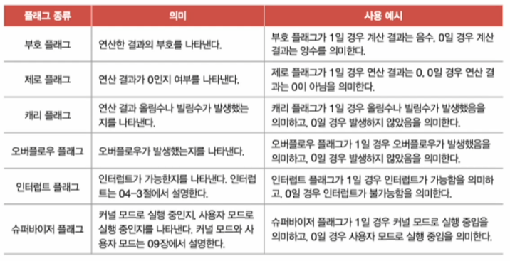 플래그는 연산 결과에 대한 부가 정보이다. 연산 결과가 음수라면, 연산 결과가 음수라는 부가 정보가 플래그 레지스터에 저장된다.