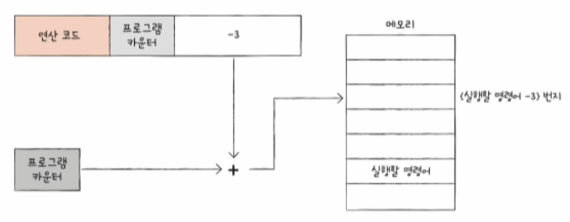 상대 주소 지정 방식 : 오퍼랜드 필드의 값(변위)과 프로그램 카운터의 값을 더하여 유효 주소 얻기