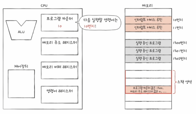 인터럽트를 처리하기 위해 지금까지 작업한 정보가 있는 레지스터는 어딘가에 백업을 해야 하는데, 스택에 백업을 한다.