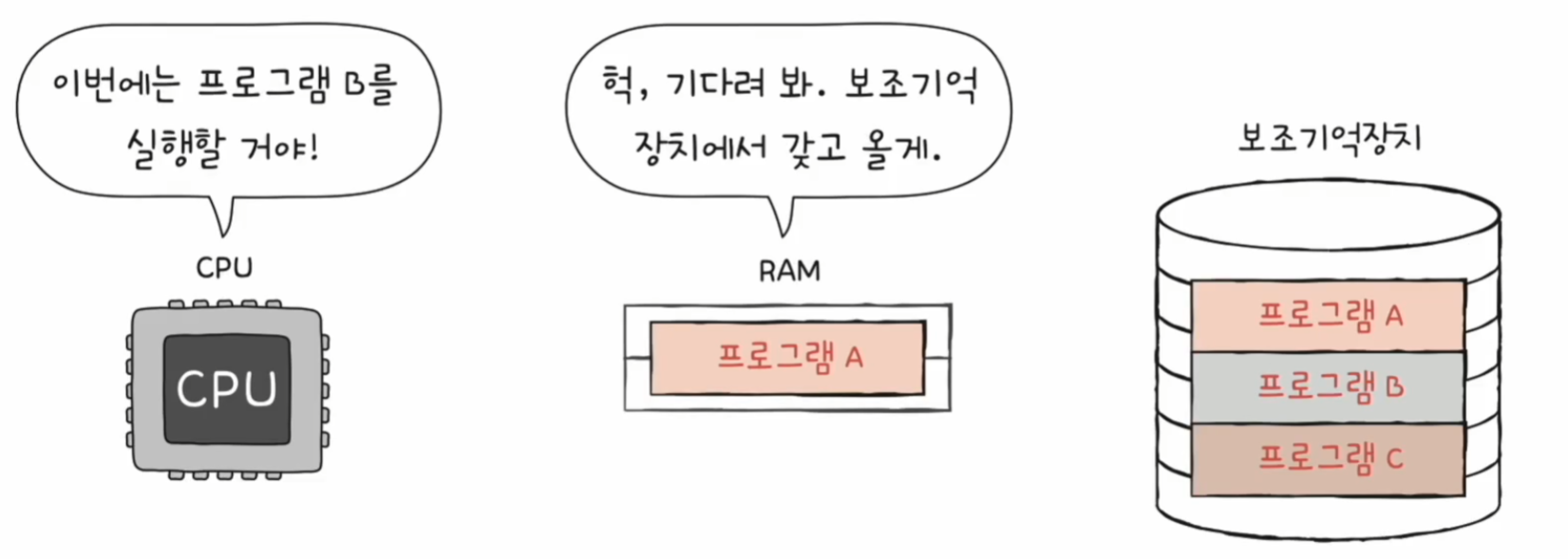 RAM은 실행할 대상을 저장한다. 하지만 RAM에 저장한 내용은 전원이 꺼지면 사라진다. 그래서 전원이 꺼져도 기억할 수 있는 보조기억장치가 필요하다.