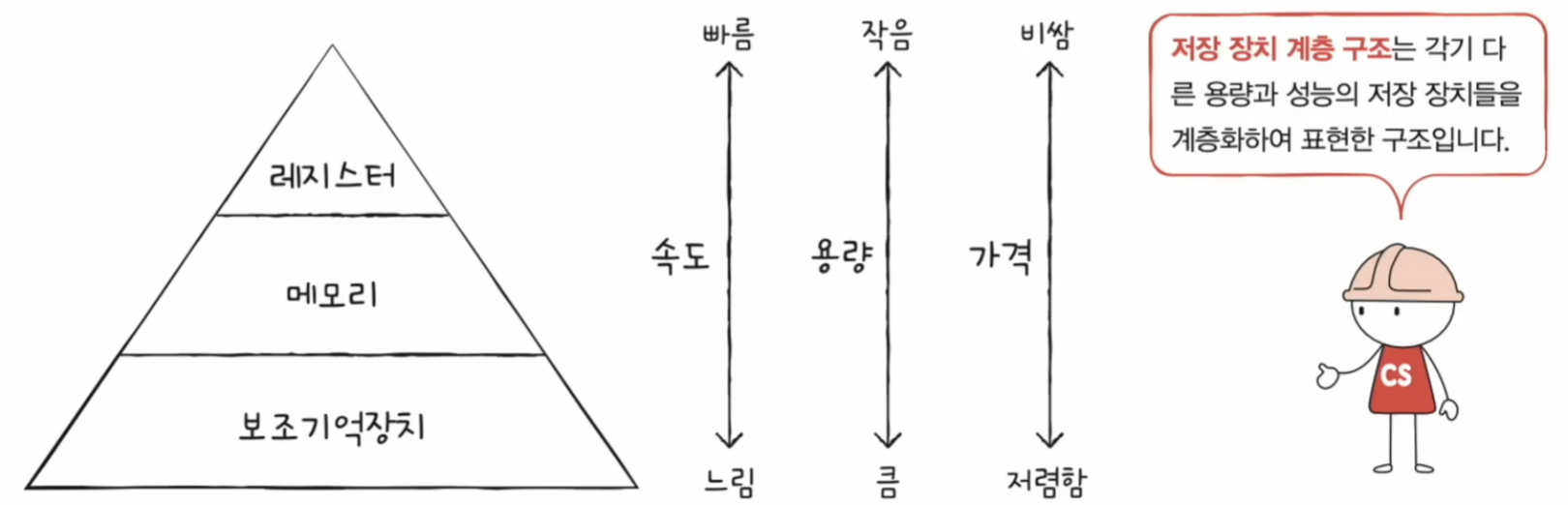 - 속도가 빠른 저장 장치는 저장 용량이 적고, 가격이 비싸다.