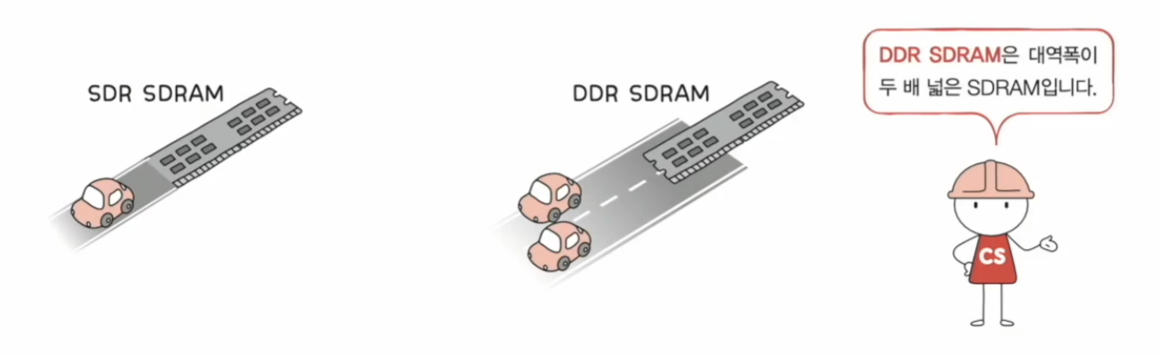 - 대역폭을 넓혀 속도를 빠르게 만든 SDRAM