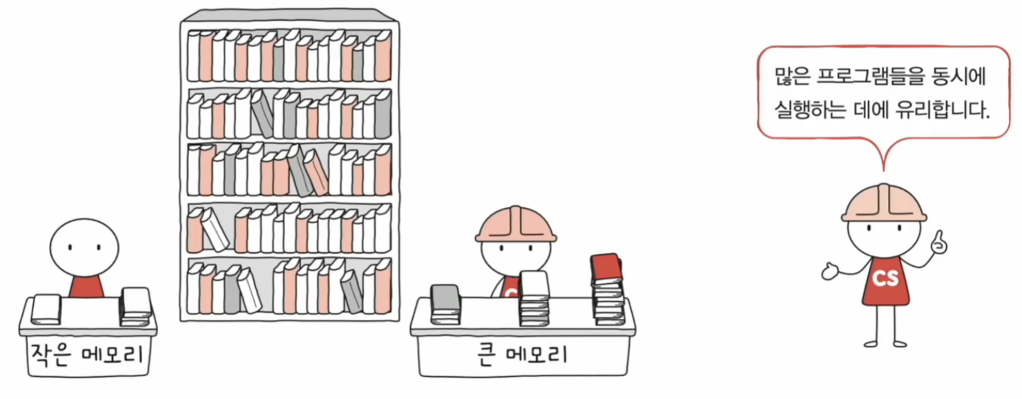 책장을 보조기억장치, 책상을 RAM으로 비유하면 위 그림과 같다. 책상이 크다면 많은 책들을 미리 책상에 놓고 필요할 때 볼 수 있다.