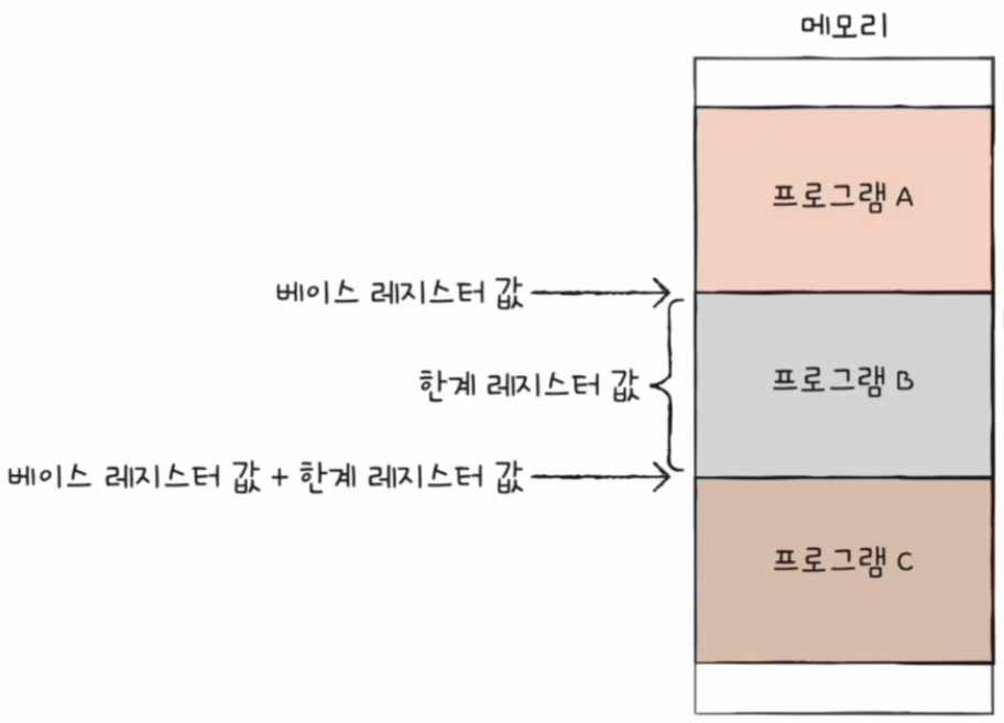 - 베이스 레지스터가 실행 중인 프로그램의 가장 작은 물리 주소를 저장한다면, 한계 레지스터는 논리 주소의 최대 크기를 저장