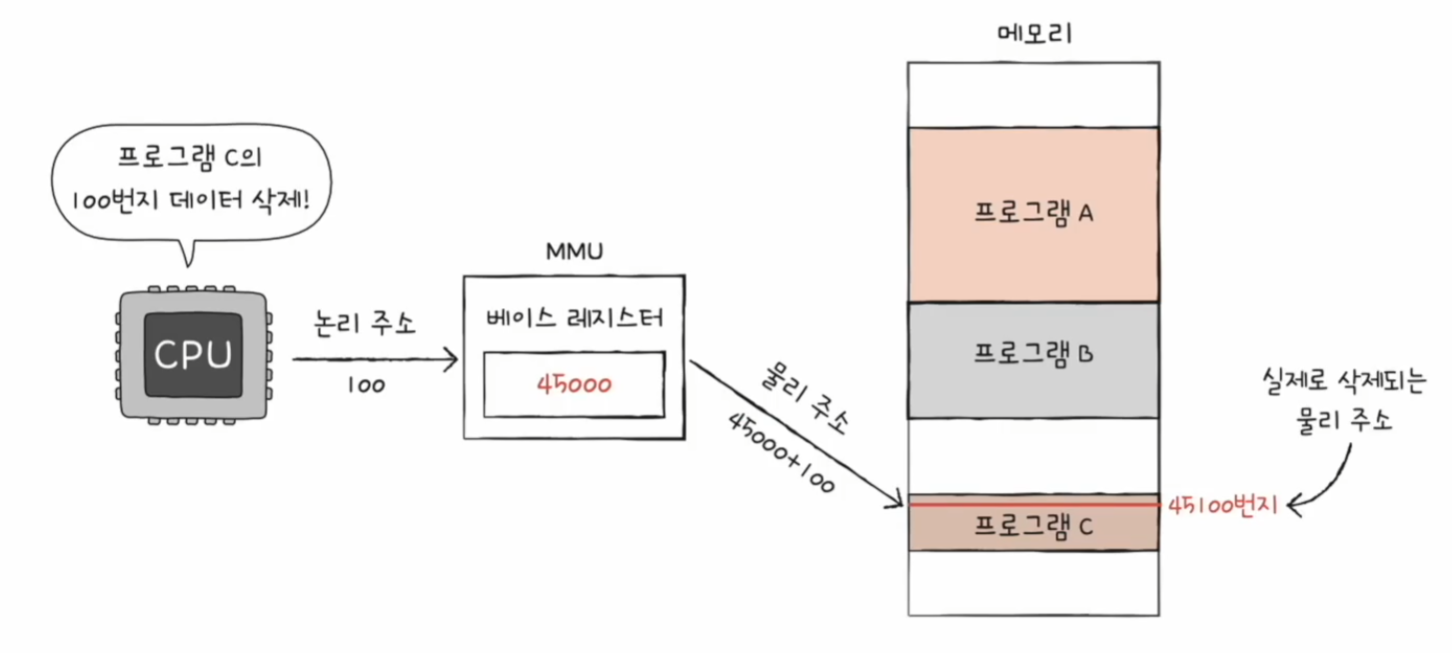 MMU는 논리 주소와 베이스 레지스터(프로그램의 기준(시작) 주소) 값을 더하여 논리 주소를 물리 주소로 변환한다. 논리 주소는 실제로 저장된 프로그램으로부터 얼마나 떨어져 있느냐에 해당하는 정보라고 생각할 수 있다.