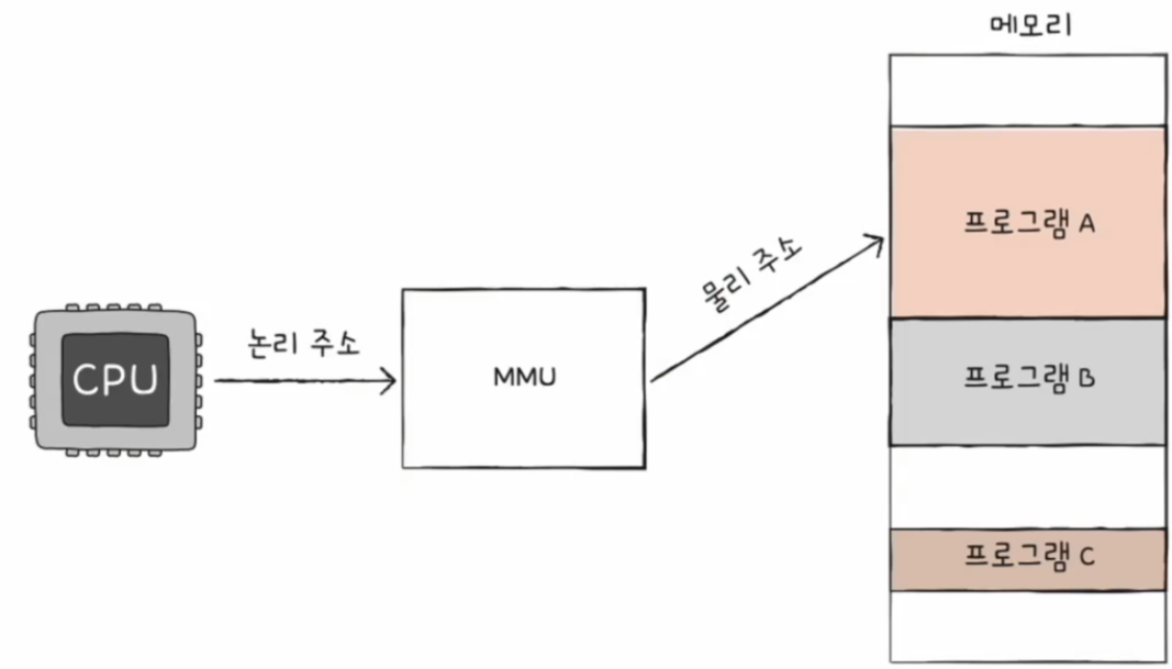 CPU가 이해하고 실행하는 주소는 모두 논리 주소이다. 논리 주소를 주소 버스를 통해 실제 메모리와 주고받을 때에는 항상 MMU를 거치게 된다.