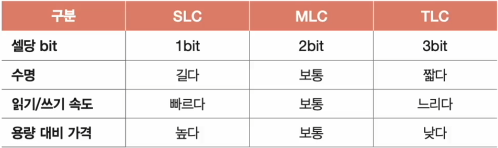 - 3비트를 저장할 수 있는 플래시 메모리 : TLC